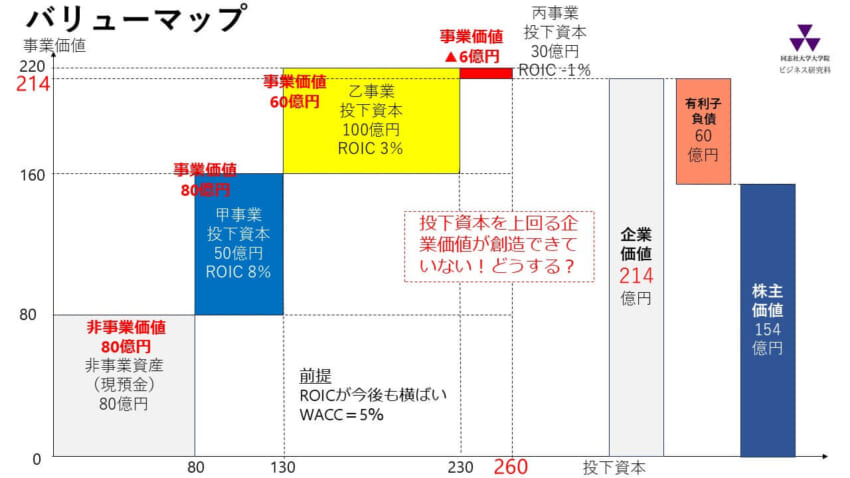 乙事業はROICがWACCを下回っており(黄ゾーン)、投下資本を下回る事業価値しか生み出していません。