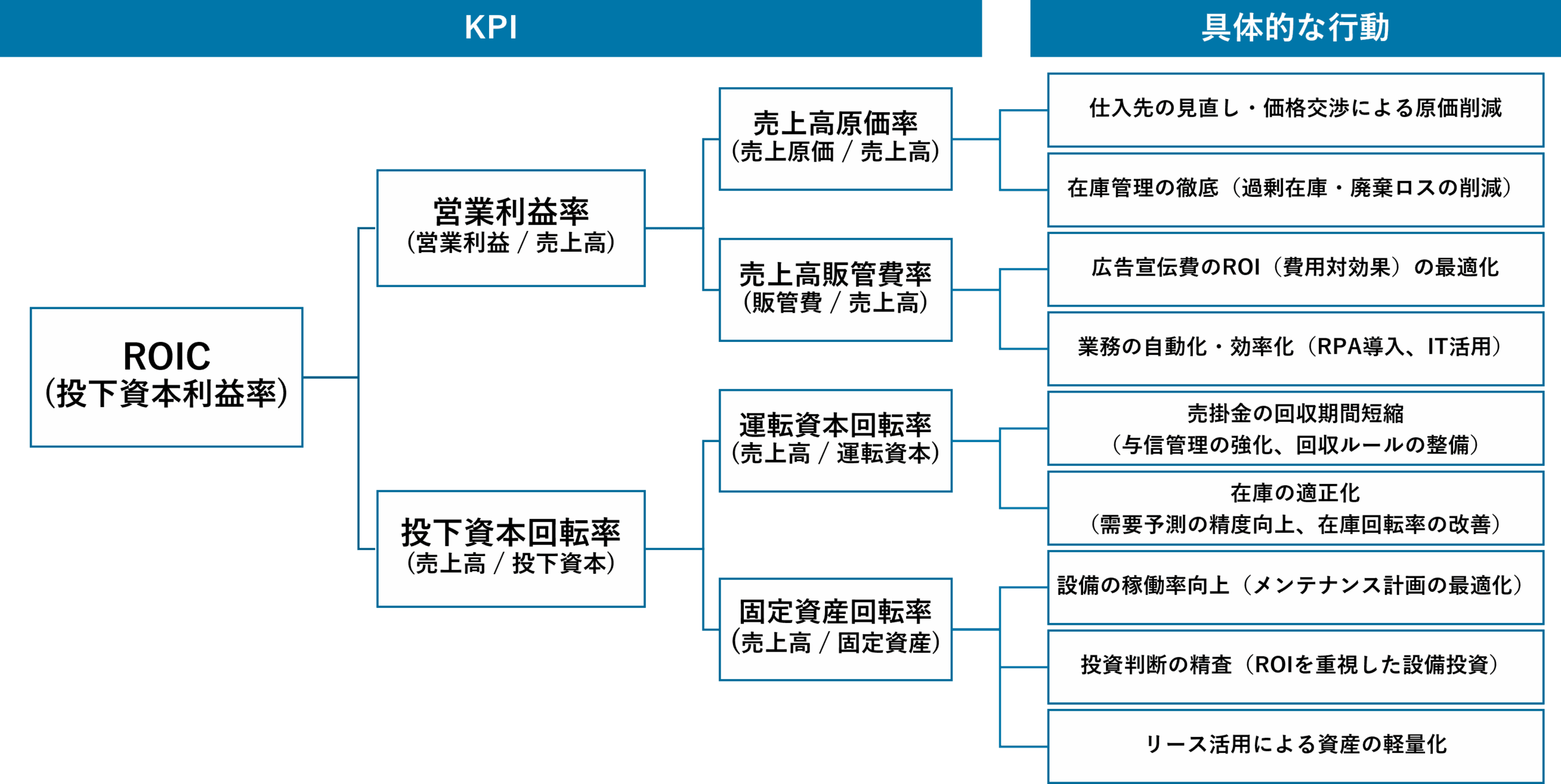 こうした課題を解決するため、以下のような「ROICツリー」を作成し、社内で活用している企業もあります。